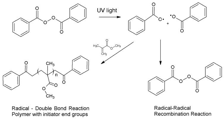 An example of this type of reaction is a photoinitiator. After absorbing light, a chemical bond can break homolytically to form two radicals. The radicals can react with monomers to polymerize or they can react with another radical to reform covalent bonds.