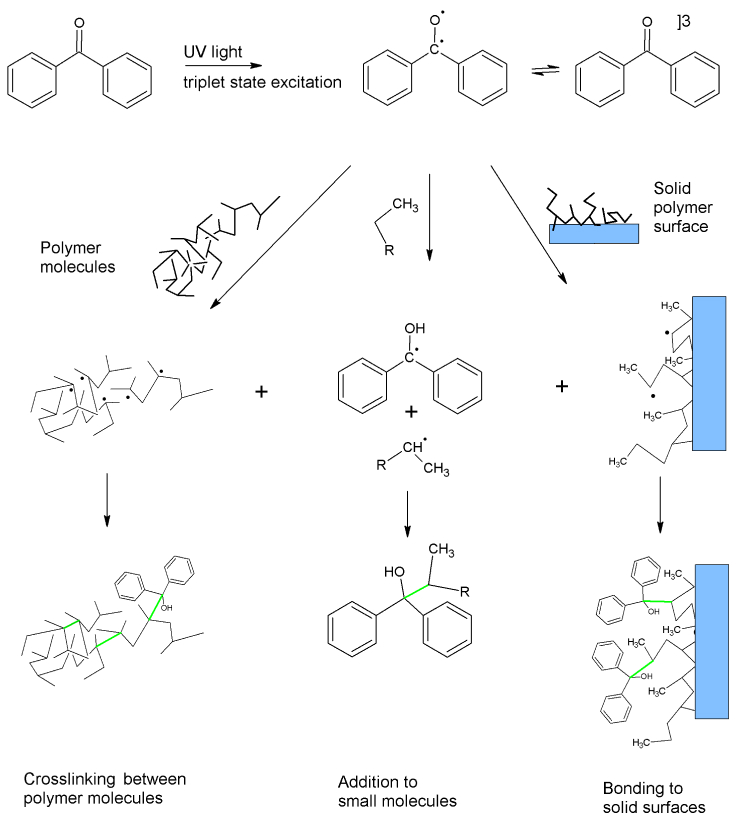 Similarly, other photoreactive molecules can absorb light to enter an excited state in which they act as pseudo-diradicals. In this state the molecules can abstract hydrogen atoms, creating radicals on otherwise unreactive molecules. If the radicals are on a polymer or polymeric substrate, they can recombine, forming covalent bonds in a process called crosslinking. These new carbon-carbon bonds are strong and provide durability to the crosslinked material.