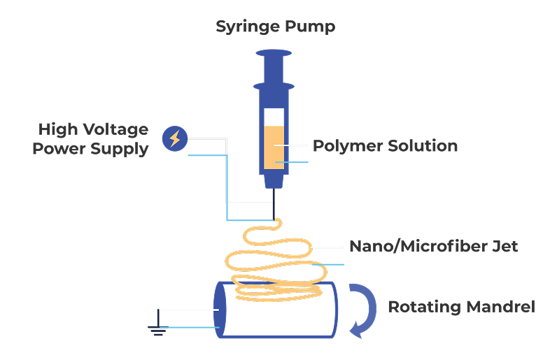 The mandrel (right) rotates and the nozzle (left) horizontally translates as a jet of polymer solution travels from the nozzle to the mandrel via applied high voltage. The solution reaches the mandrel as a polymer fiber to create a non-woven scaffold (pop-out).